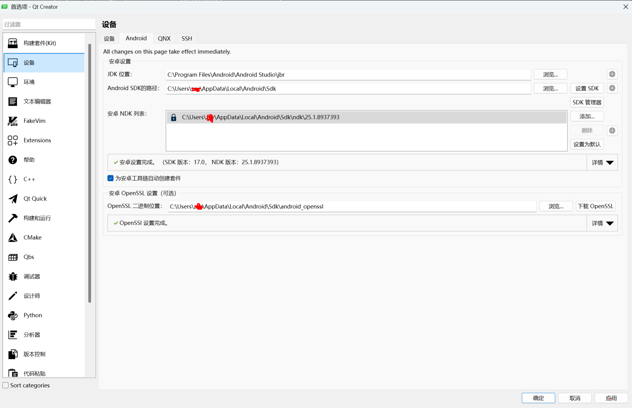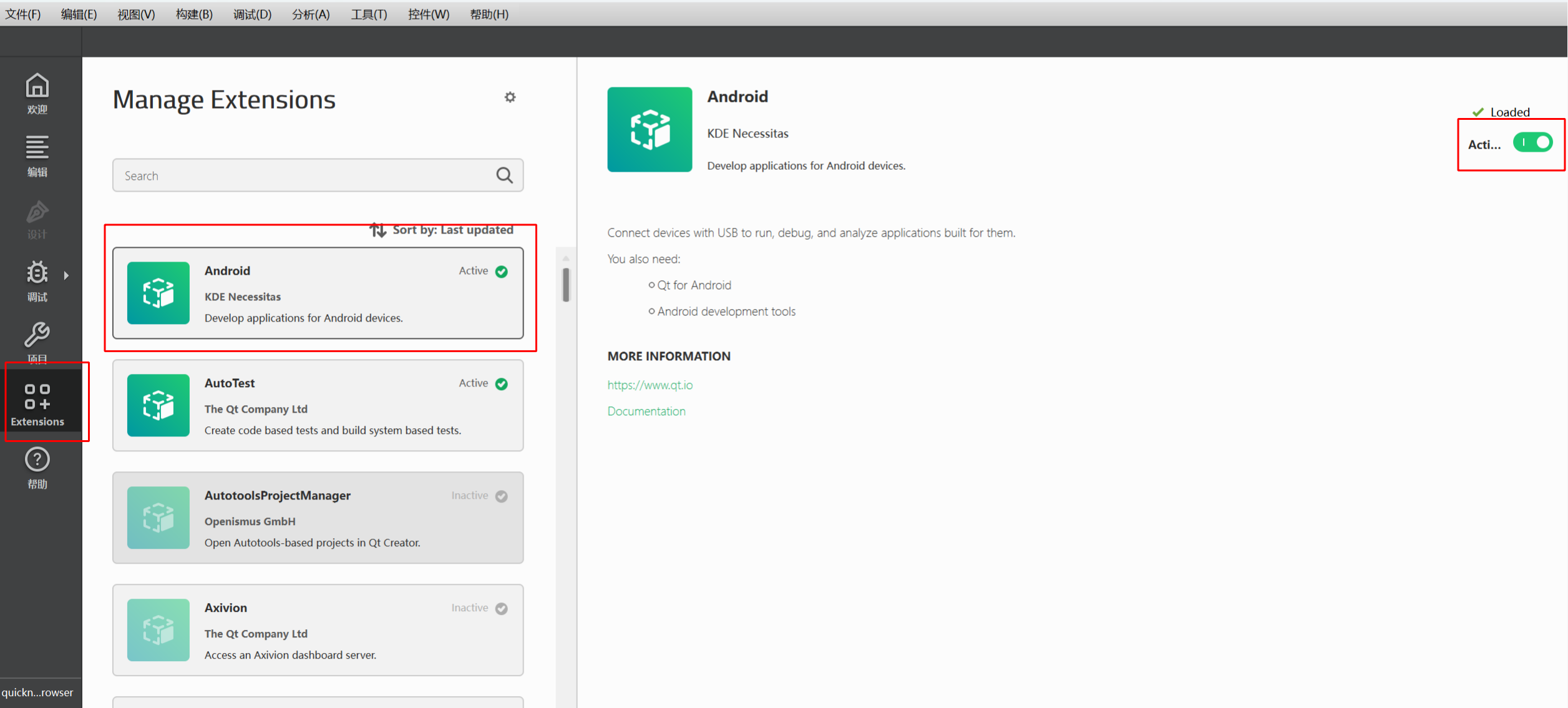 由于最新版本默认中是没有Android选项的,而大部分的教程都是人云亦云,告诉在qt creater中打开设备在Android下面设置jdk ,sdk 等,默认确没有这个选项,找了好久才发现,qt默认是把这选项关了的,如果想显示,只需要在Extensions中将Android active,重启即可。